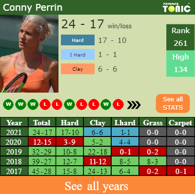 Perrin has a winning match record in the last 8 years having won 57% of her matches (326-247). 17-10 on hard in 2021. Talking about her performance on the same surface of this competition, Perrin has a compiled107-72 match record in the last 8 years on hard.