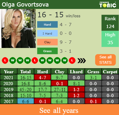 Olga has a composed 16-15 win-loss record in 2021, 9-7 on clay (See FULL STATS).