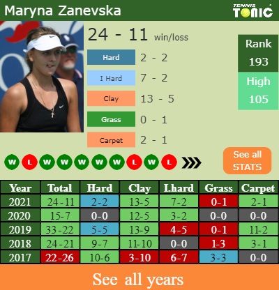 In terms of her career, Zanevska has an overall 390-240 record. She has a positive 187-111 record on clay.