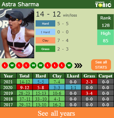Sharma has an overall 14-12 win-loss record in 2021, 7-4 on clay (See FULL STATS).