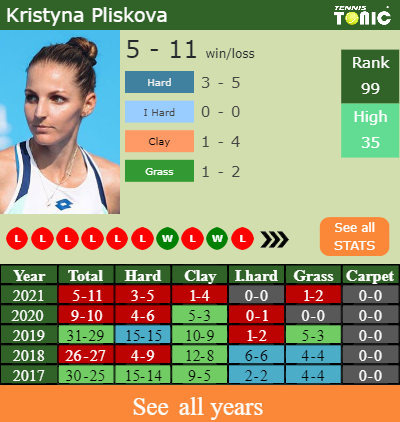 Pliskova has an overall 5-11 win-loss record in 2021, 1-4 on clay (See FULL STATS).