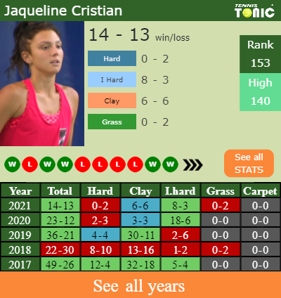 Cristian has a solid win-loss record in the last 7 years having won 60% of her matches (200-131). 6-6 on clay in 2021. Talking about her performance on the same surface of this tournament, Cristian has a composed103-68 win-loss record in the last 7 years on clay.