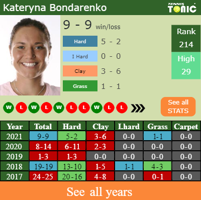 The Ukrainian has a compiled 9-9 win-loss record in 2021, 3-6 on clay (See FULL STATS).