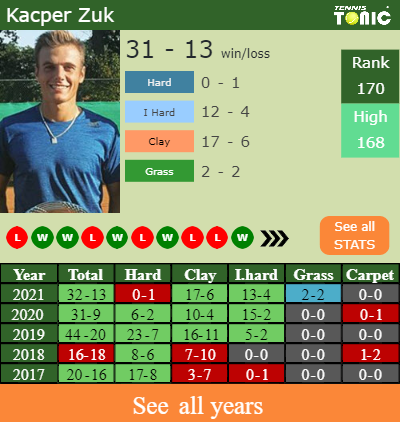 Zuk has a solid win-loss record in the last 6 years having won 65% of his matches (154-83). 17-6 on clay in 2021. Talking about his performance on the same surface of this tournament, Zuk has a composed56-41 match record in the last 6 years on clay.