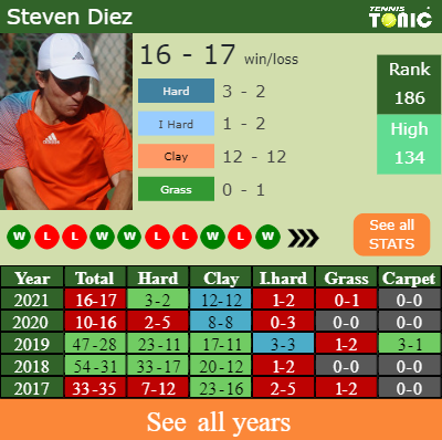 Diez has a favorable win-loss record in the last 10 years having won 59% of his matches (381-263). 12-12 on clay in 2021. Talking about his performance on the same surface of this tournament, Diez has an overall 225-147 match record in the last years on clay.