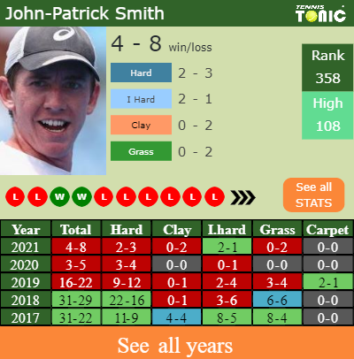 John-Patrick has an overall 4-8 win-loss record in 2021, 2-3 on hard (See FULL STATS).