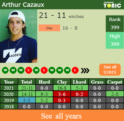 The French player has a compiled 21-11 win-loss record in 2021, 16-8 on clay (See FULL STATS).