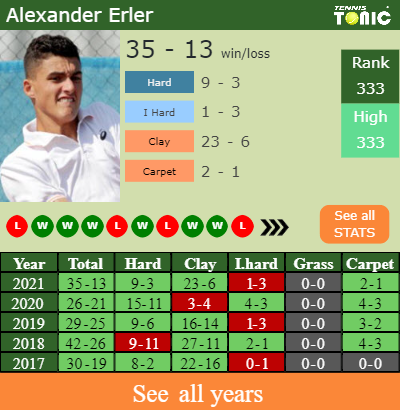 Erler has an aggregate 35-13 win-loss record in 2021, 23-6 on clay (See FULL STATS).