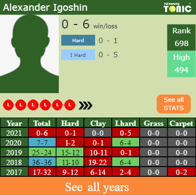 Igoshin has a compiled 0-6 win-loss record in 2021, 0-1 on hard (See FULL STATS).