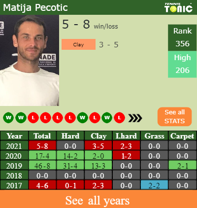 Pecotic has a compiled 5-8 win-loss record in 2021, 3-5 on clay (See FULL STATS).