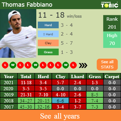 The Italian has an aggregate 11-18 win-loss record in 2021, 5-7 on clay (See FULL STATS).