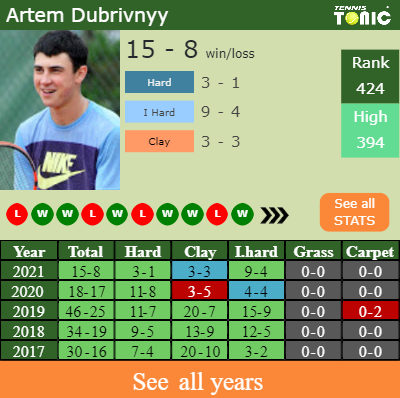Dubrivnyy has a compiled 15-8 win-loss record in 2021, 3-1 on hard (See FULL STATS).