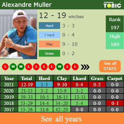 Muller has an overall 12-19 win-loss record in 2021, 9-10 on clay (See FULL STATS).