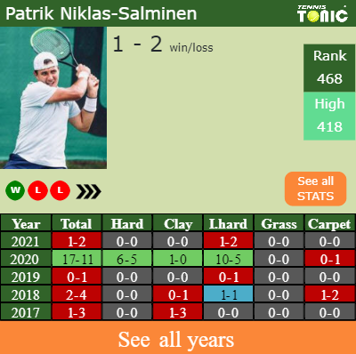 Ranked no. 468, Niklas-Salminen will start his run in the Tampere Challenger after he played his last match in Sultan where he lost 4-6 6-4 6-2 to Weightman in the 1st round on the 10th of February.