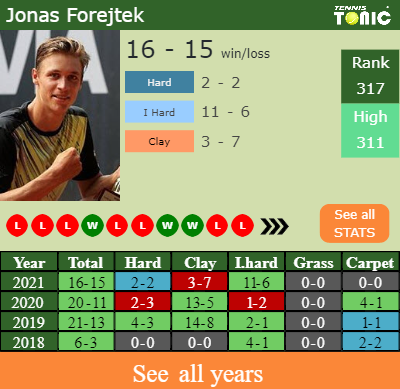 Jonas has an aggregate 16-15 win-loss record in 2021, 3-7 on clay (See FULL STATS).