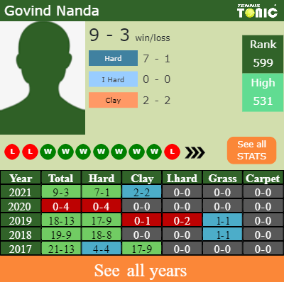 Nanda has an aggregate 9-3 win-loss record in 2021, 7-1 on hard (See FULL STATS).