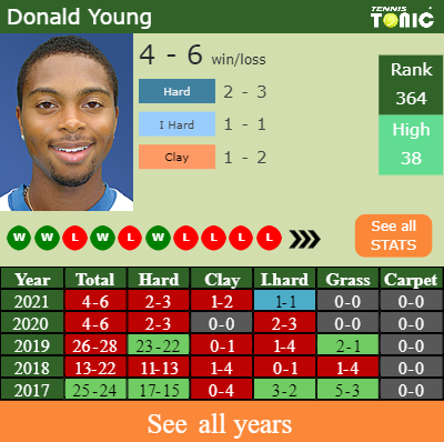 Young has an aggregate 4-6 win-loss record in 2021, 2-3 on hard (See FULL STATS).