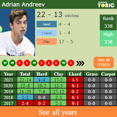 Andreev has a composed 22-14 win-loss record in 2021, 4-4 on hard (See FULL STATS).