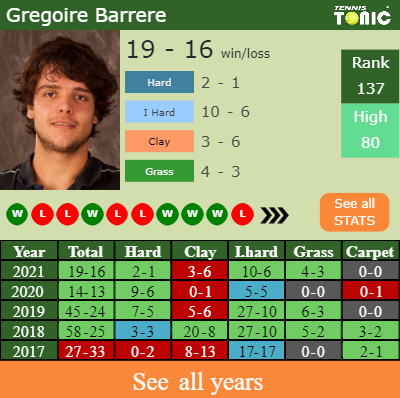 Barrere has a compiled 19-16 win-loss record in 2021, 2-1 on hard (See FULL STATS).