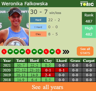 This will be the 2nd time that Kateryna Bondarenko and Weronika Falkowska face off. The head to head is 1-0 for Bondarenko (see full H2H stats), 1-0 on clay.