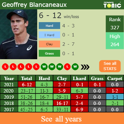 Blancaneaux has a compiled 6-12 win-loss record in 2021, 2-7 on clay (See FULL STATS).