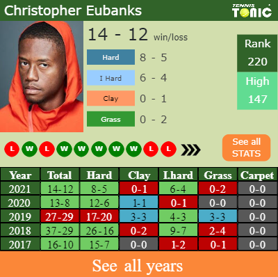 Eubanks has a compiled 14-12 win-loss record in 2021, 8-5 on hard (See FULL STATS).