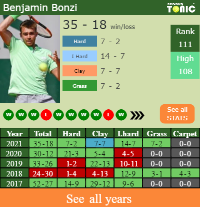 Bonzi has a composed 35-18 win-loss record in 2021, 7-2 on hard (See FULL STATS).