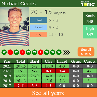 Bonzi played 1 match while Geerts competed in 3 matches. Geerts started his run from the qualifications while Bonzi had a direct access to the main draw. At the moment, Benjamin Bonzi surrendered 1 set while Michael Geerts hasn’t surrendered a set so far. Bonzi has played 3 set(s) less than Geerts (3 vs 6). Therefore, Bonzi played 21 games less than Geerts. Benjamin scored 40 winners (42% of the total points). On the other side, The Belgian scored 73 winners (42%).