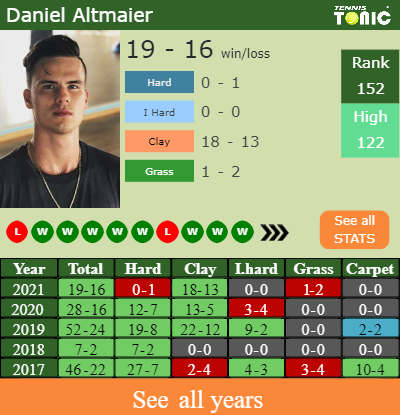 Altmaier has a composed 19-16 win-loss record in 2021, 18-13 on clay (See FULL STATS).