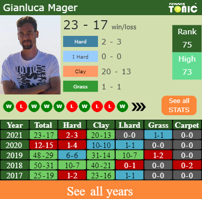 Mager has a winning record in the last 8 years having won 57% of his matches (308-230). 20-13 on clay in 2021. Talking about his performance on the same surface of this event, Mager has a compiled251-161 match record in the last 8 years on clay.