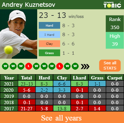 Andrey has an overall 23-13 win-loss record in 2021, 8-3 on hard (See FULL STATS).