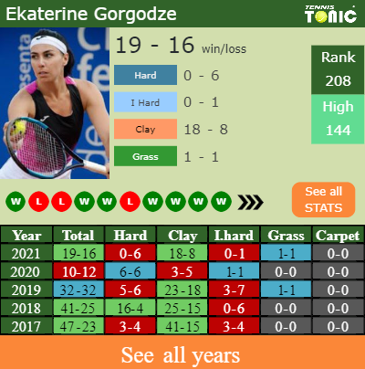 Gorgodze has an overall 19-16 win-loss record in 2021, 18-8 on clay (See FULL STATS).