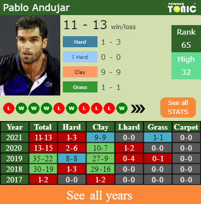 The Spaniard has a compiled 11-13 win-loss record in 2021, 1-3 on hard (See FULL STATS).