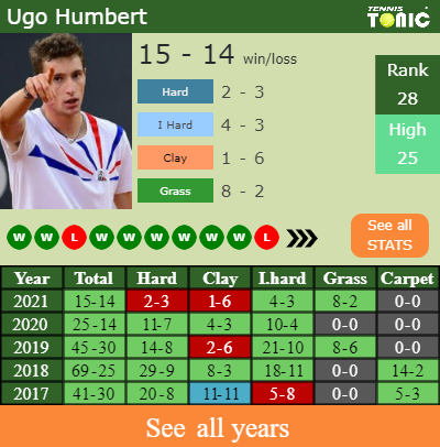 Humbert has a compiled 15-14 win-loss record in 2021, 2-3 on hard (See FULL STATS).