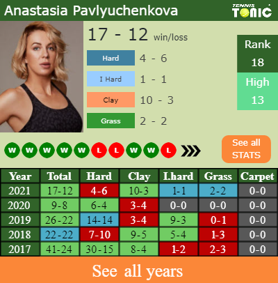 Talking about her overall career, Anastasia has an overall 475-310 record. She has a positive 252-167 record on hard.