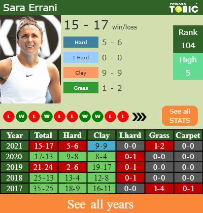Sara has an overall 15-17 win-loss record in 2021, 5-6 on hard (See FULL STATS).
