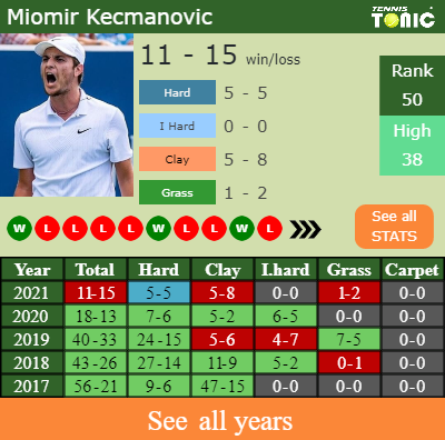 The Serbian has an aggregate 11-15 win-loss record in 2021, 5-5 on hard (See FULL STATS).