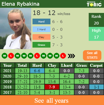 Elena has an overall 19-13 win-loss record in 2021, 6-6 on hard (See FULL STATS).