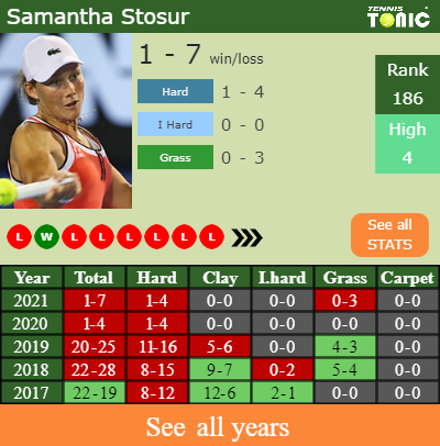 Samantha has a compiled 1-7 win-loss record in 2021, 1-4 on hard (See FULL STATS).