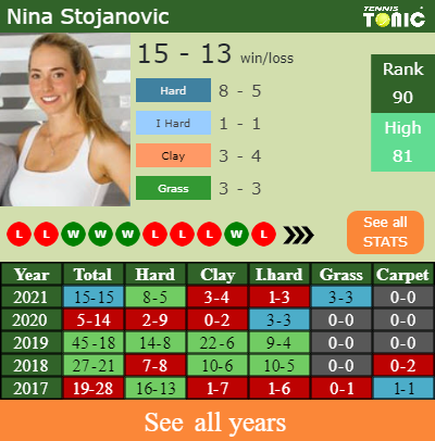 Nina has an aggregate 15-15 win-loss record in 2021, 8-5 on hard (See FULL STATS).