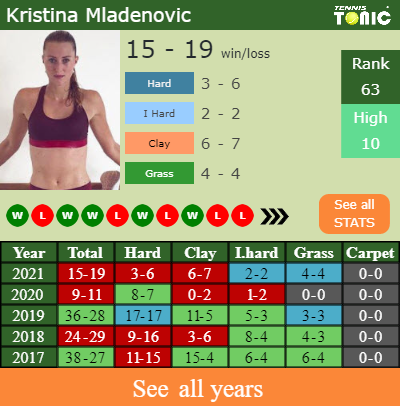 Kristina has a composed 15-19 win-loss record in 2021, 3-6 on hard (See FULL STATS).