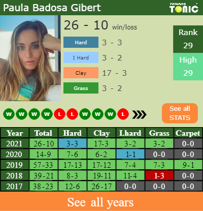 Paula has an overall 26-10 win-loss record in 2021, 3-3 on hard (See FULL STATS).
