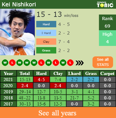 In terms of his career, Nishikori has an overall 549-256 record. He has a positive 264-126 record on hard.