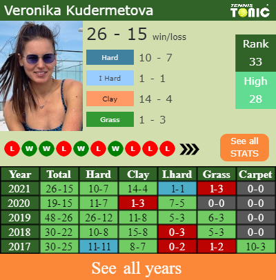 The Russian has an overall 26-15 win-loss record in 2021, 10-7 on hard (See FULL STATS).