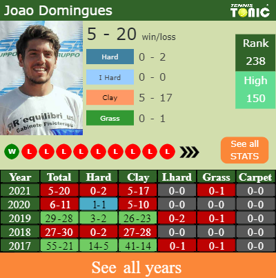 The Portuguese has an overall 5-20 win-loss record in 2021, 5-17 on clay (See FULL STATS).