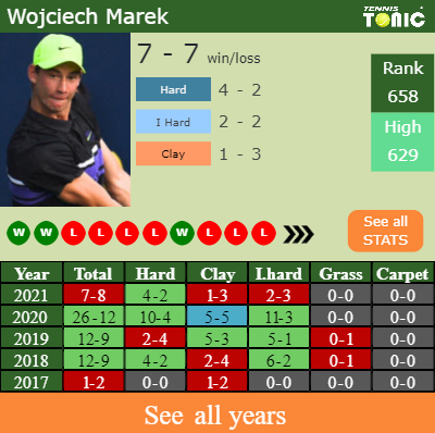 Wojciech has an overall 7-8 win-loss record in 2021, 1-3 on clay (See FULL STATS).