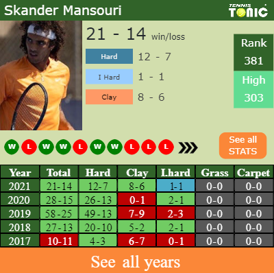 Mansouri has an aggregate 21-14 win-loss record in 2021, 12-7 on hard (See FULL STATS).