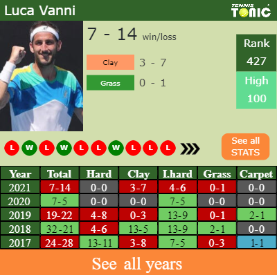 In terms of his career, Vanni has an overall 186-193 record. He has a positive 68-66 record on hard.