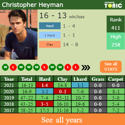 Christopher has an overall 16-13 win-loss record in 2021, 14-8 on clay (See FULL STATS).