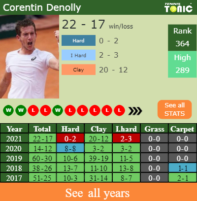 Corentin has an aggregate 22-17 win-loss record in 2021, 20-12 on clay (See FULL STATS).